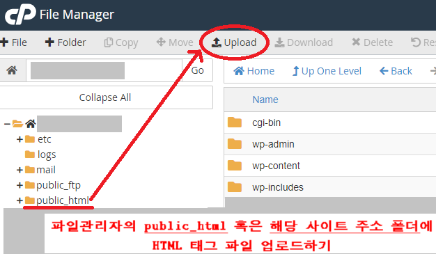 C패널 로그인 → 파일관리자(File Manager) →public_html 폴더에 핀터레스트 HTML 태그 파일을 업로드 해줍니다.