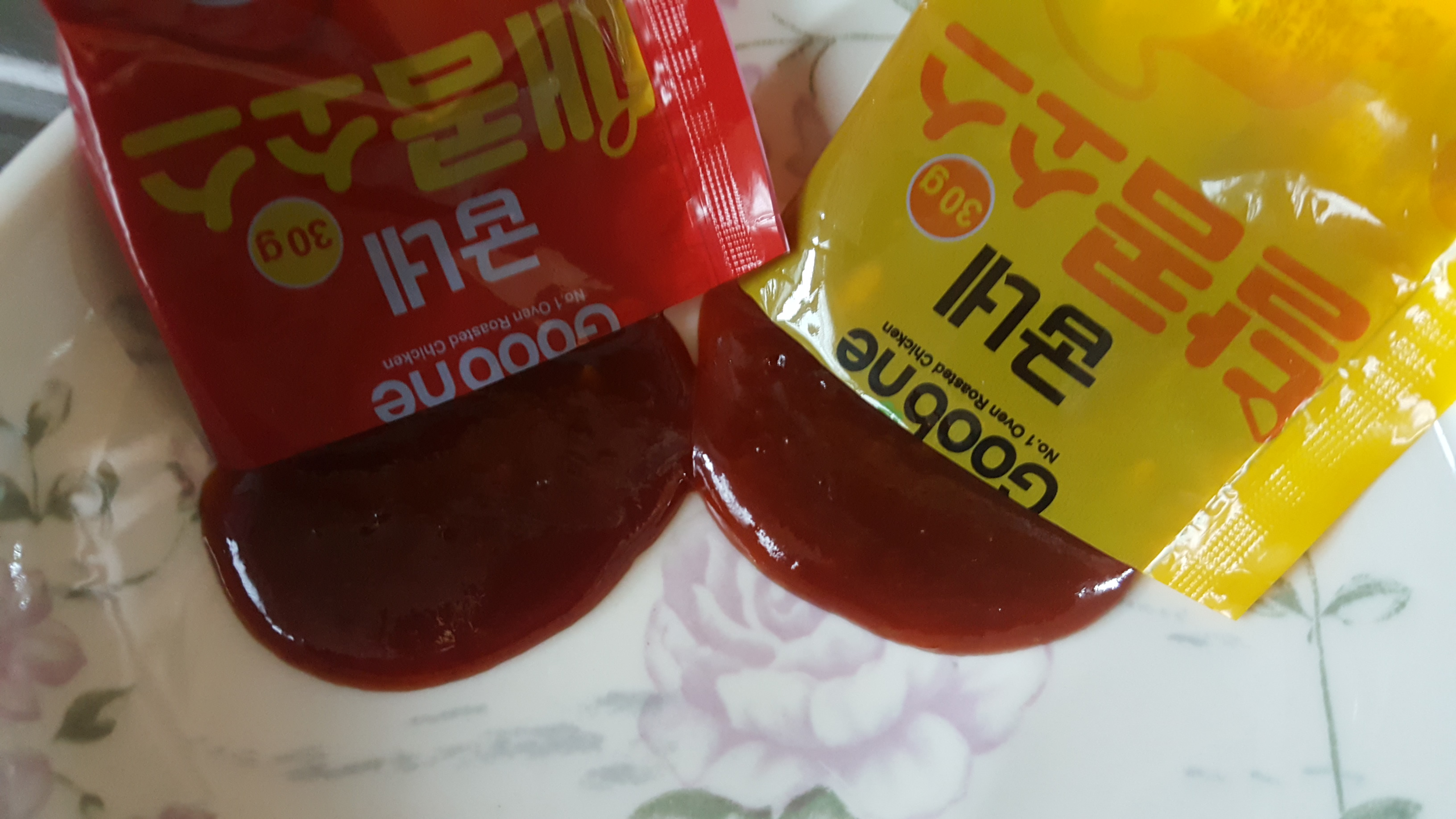 마트에서 산 대림선 쫄깃 찰순대와 치킨 시켜먹고 남은 굽네 달콤소스, 매콤소스 모습