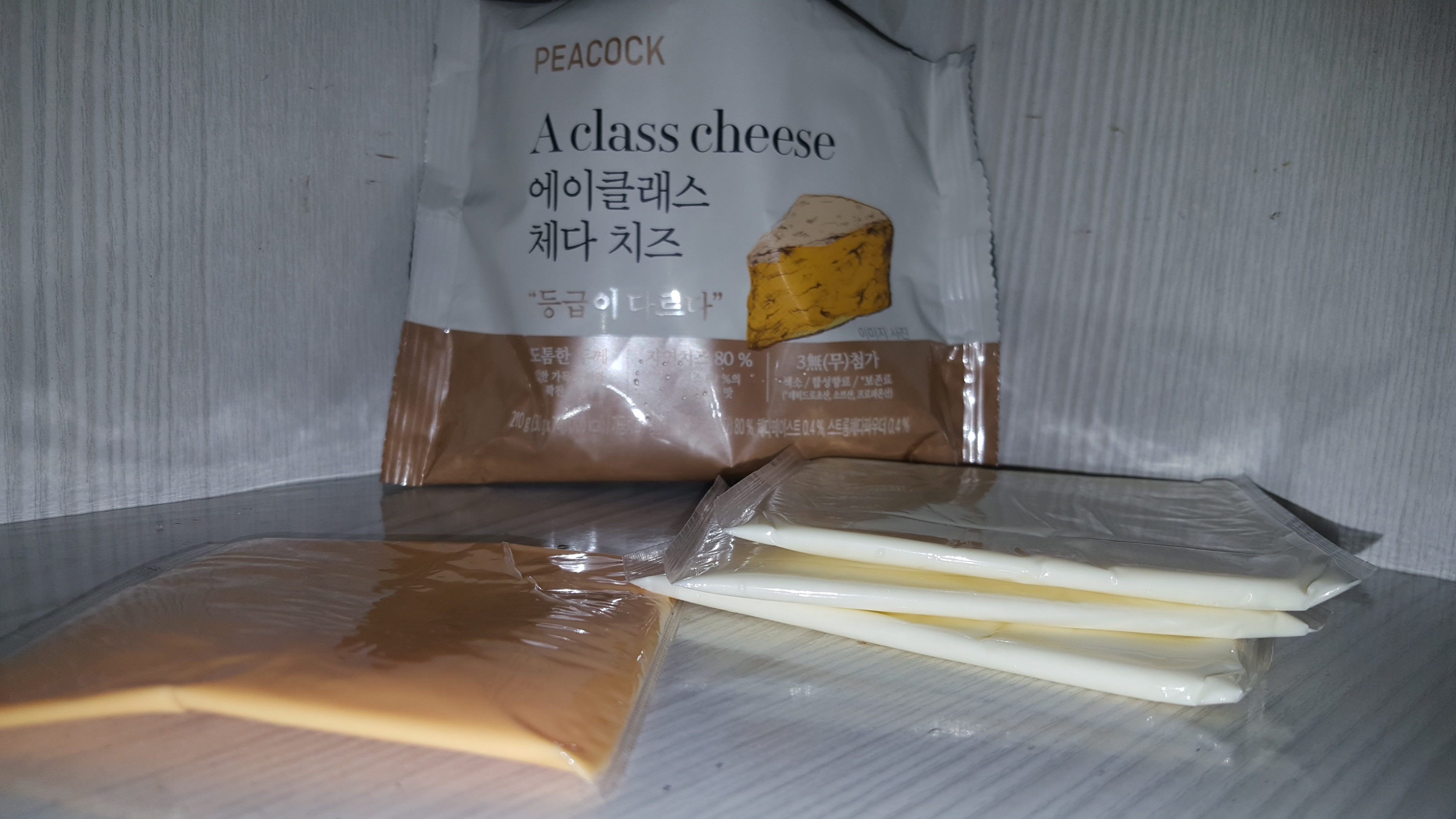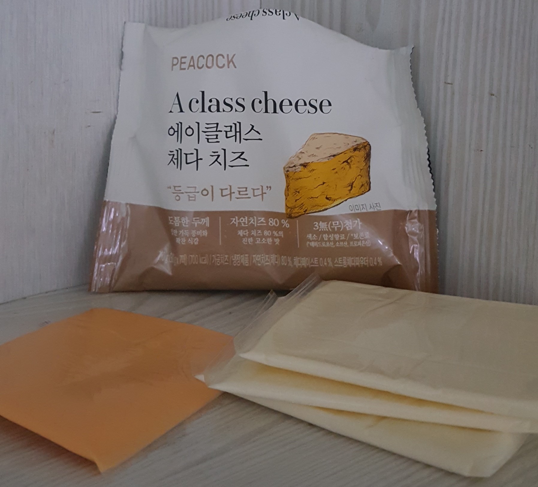 치즈는 피코크 에이클래스 체다 치즈를 추천드립니다. 치즈의 두께가 두툼합니다. 다른 제품의 치즈(왼쪽)와 놓고 비교해 보면 확연한 두께와 무게의 차이를 느낄 수 있었습니다. 처음엔 아무 생각 없이 피코크 에이클래스 체다 치즈를 구입했는데 냉장고에 먹다 남은 다른 치즈를 양손에 놓고 비교해 보니 다르다는 것 눈과 무게로 확실히 느낄 수가 있었습니다. 치즈를 구입하신다면, 피코크 에이클래스 체다 치즈 추천드립니다.