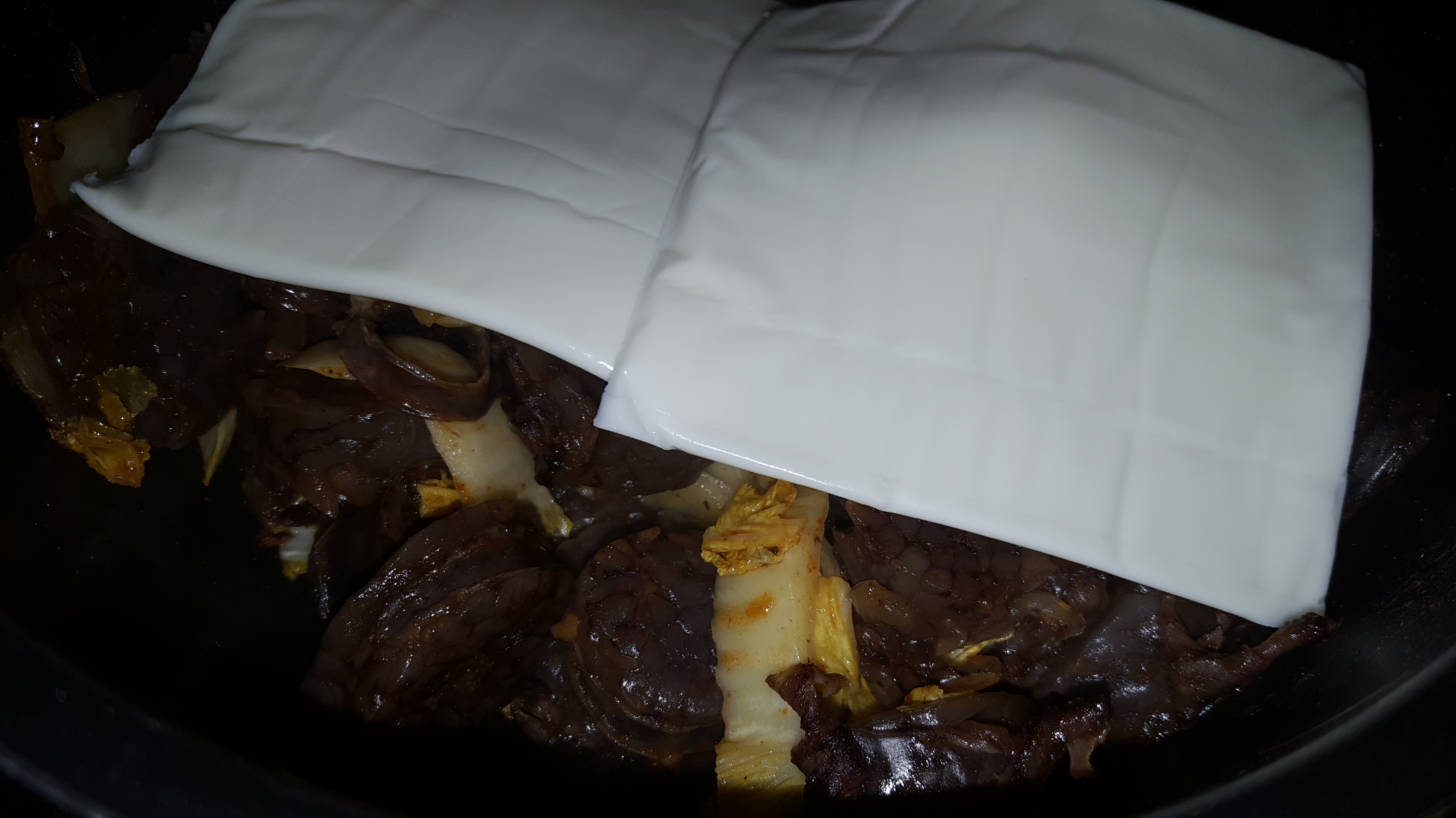 치즈 이불을 덮은 순대볶음의 모습입니다. 순대가 맛은 있지만 채소 및 소스와 볶아진 모양이 예쁘지 못해서 살포시 치즈 이불을 두 장 덮어주었습니다.